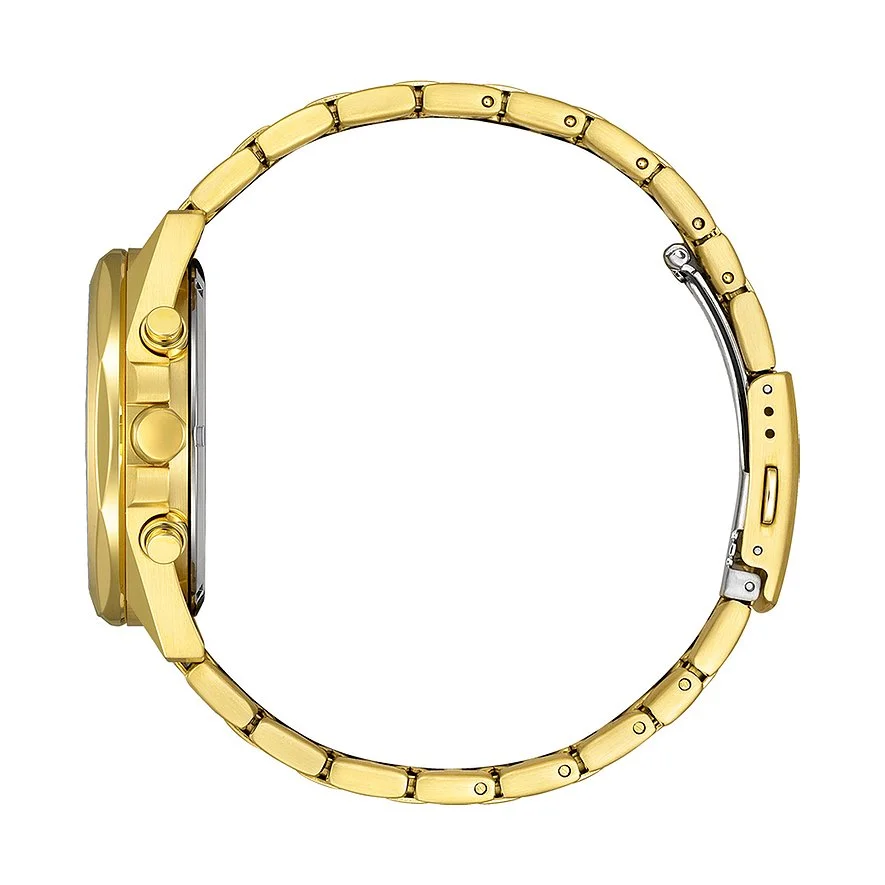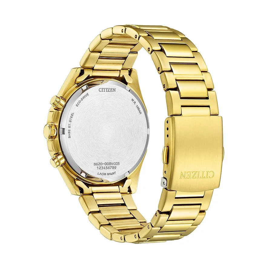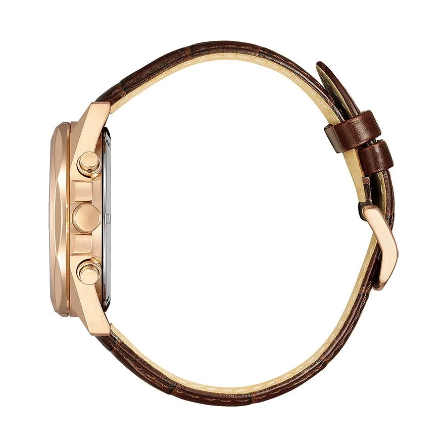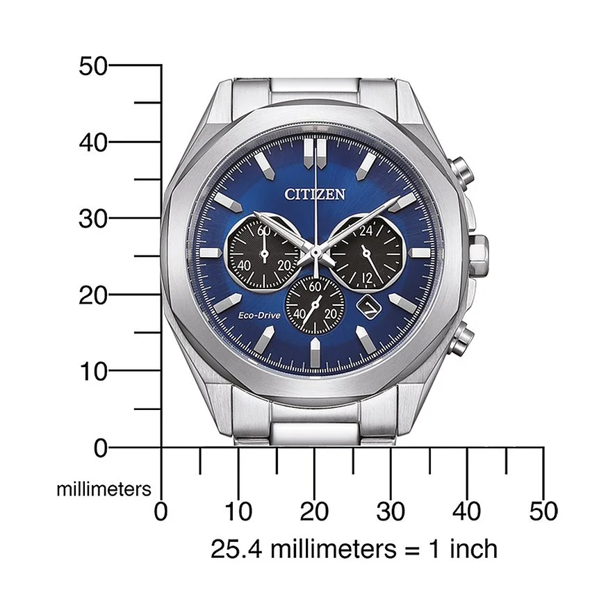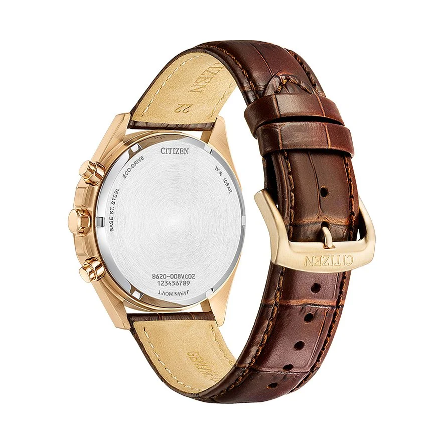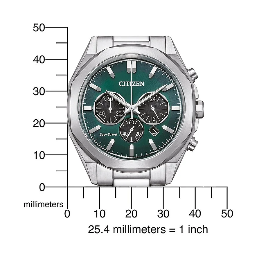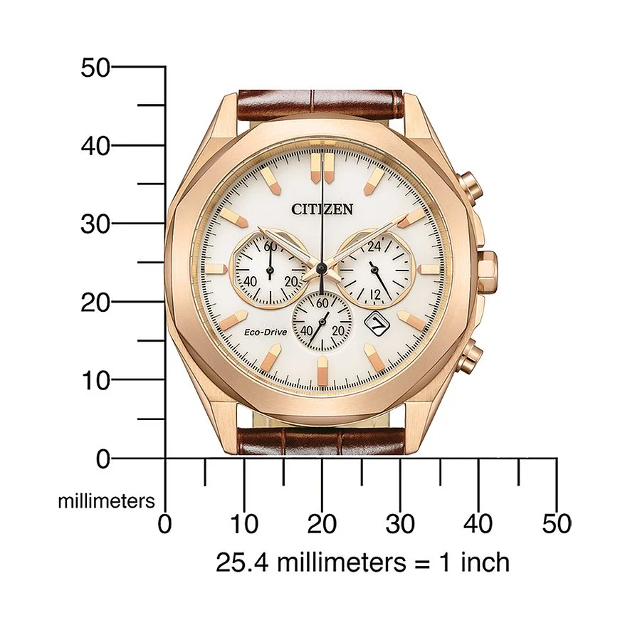 Citizen zählt zu den weltweit führenden Herstellern in der Uhrenindustrie und produziert durchschnittlich jede Sekunde eine Uhr. Die beliebten Zeitmesser der Marke, die 1918 gegründet wurde, werden in einer echten Manufaktur hergestellt und stellen technische Kompetenz und modische Vielfalt eindrucksvoll unter Beweis. Die Citizen Chronograph Eco-Drive, der perfekte Chronograph für der sportliche Herr, überzeugt durch ihr Edelstahlgehäuse und das Lederband. Bei einem Gehäusedurchmesser von 41 mm und einer Gehäusehöhe von 12 mm ist diese Uhr zwar auffälliger, dicker, aber dennoch passt sie an eine Vielzahl von Handgelenken. Der kühle Schimmer des Edelstahlgehäuses verleiht der Uhr einen hochwertigen Look, die Lünette schließt das Ganze harmonisch ab. Markierungen sorgen auf dem Ziffernblatt in Creme für gute Ablesbarkeit, auch die Zeiger sind darauf hervorragend erkennbar. Der Chronograph besitzt eine Datumsanzeige auf dem Ziffernblatt. Mit einer Wasserdichte von 10 bar ist das Schwimmen ohne Probleme möglich. Durch das hochwertige, wartungsarme Quarzwerk in dieser Uhr ist höchste Präzision garantiert. Die Uhr sitzt dank des Lederbands in klassischem Braun und der Dornschließe besonders sicher und bequem. Als ein gelungenes Gesamtpaket aus Design und Technik wird diese Citizen auch in etlichen Jahren noch ihren Platz als geliebter Begleiter am Handgelenk haben.