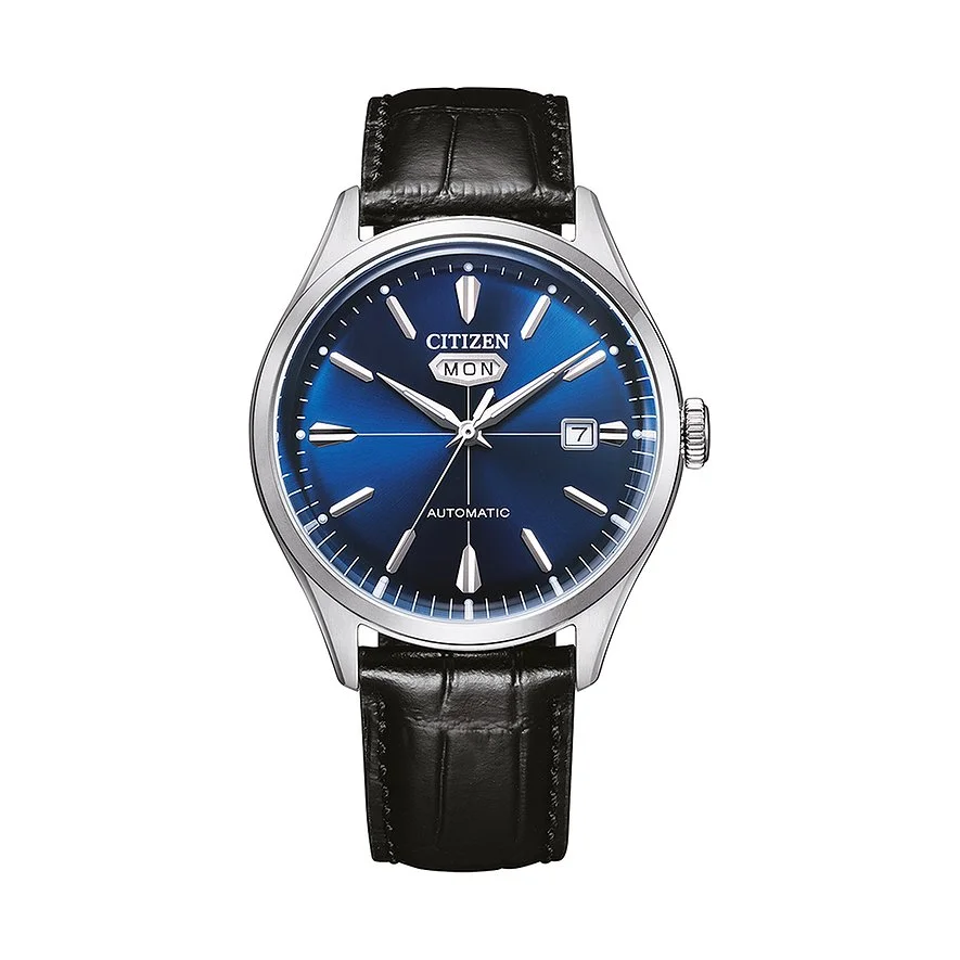Unter dem Motto „Better starts now“ produziert der renommierte Uhrenhersteller Citizen seit der Gründung im Jahr 1918 zuverlässige Zeitmesser höchster Qualität. Citizen ist eine echte Manufaktur der Uhrmacherei und in mehr als 100 Ländern der Welt tätig. Mit präziser Technologie und innovativen Designs begeistern die Uhren von Citizen jeden Tag neu und sind damit die perfekten Begleiter im Alltag. Die Mechanical Automatik Herrenuhr zaubert bei jedem Blick aufs Handgelenk ein Lächeln ins Gesicht. Ihr Gehäuse aus hochwertigem Edelstahl verleiht jedem Outfit im Nu eine edle Note. Das schwarze Leder-Armband sorgt nicht nur für angenehmen Tragekomfort, sondern rundet auch das exklusive Erscheinungsbild der Uhr perfekt ab. Sowohl an schmalen als auch an mittleren Handgelenken macht die Mechanical Automatik mit einem Gehäusedurchmesser von 40,2 mm eine hervorragende Figur. Das blaue Zifferblatt mit Markierungen fügt sich gekonnt in das Gesamtdesign ein. Äußerst praktisch: Neben der Uhrzeit verrät ein Blick auf die Uhr auch das Datum. Perfektioniert wird das Gesicht der Uhr durch die silberne Lünette. Im Inneren der Uhr verrichtet ein Automatikwerk zuverlässig und präzise seine Arbeit. Der bewegliche Rotor wird durch die täglichen Bewegungen beim Tragen angetrieben, so dass kein manuelles Aufziehen erforderlich ist. Dank einer Wasserdichte von 5 bar kann die Uhr auch problemlos in der Badewanne getragen werden. Die Dornschließe bietet nicht nur optimalen Halt, sondern lässt sich in der Größe auch gut ans Handgelenk anpassen. Für mehr Variabilität ist das Armband leicht austauschbar – so lässt sich der Look der Uhr noch besser an verschiedene Outfits anpassen.