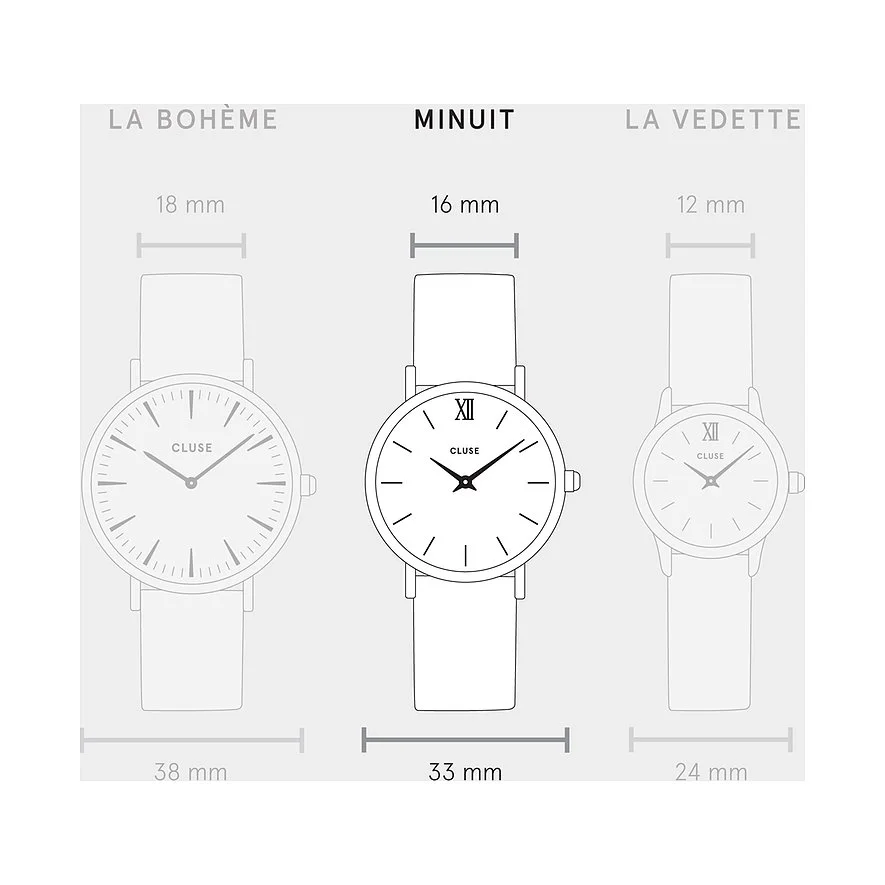 Die Mineralglas-Abdeckung der Uhr ist klar und widerstandsfähig – genau das Richtige für den normalen, täglichen Gebrauch. Mit einer Wasserdichte von bis zu 50 Metern (5 Bar) ist dieser Zeitmesser ein zuverlässiger Begleiter, da er sowohl beim Händewaschen als auch beim Baden getragen werden kann. Die Klappschließe garantiert sowohl leichtes Anlegen als auch sicheren Halt am Arm. Bleibt nur noch eins zu sagen: Die Cluse Minuit Damenuhr ist die perfekte Wahl für alle, die auf der Suche nach einem geschmackvollen und zugleich präzisen Begleiter für den Alltag sind.