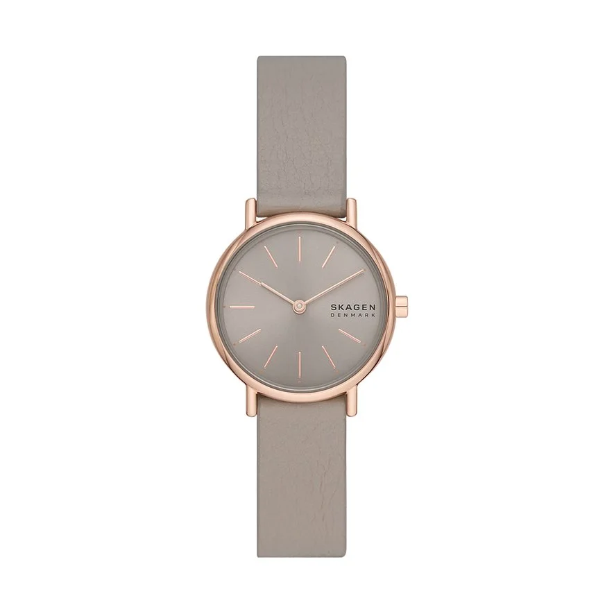 Weniger ist immer mehr: Nach diesem Leitsatz entstehen bei Skagen ikonische Uhren-Designs voll schlichter, zeitloser Eleganz. Das ruhige Leben an der dänischen Küste inspiriert die beliebte Lifestyle-Marke zu ihren typischen, minimalistischen Designs mit hohem Wiedererkennungswert. Dabei wird besonderer Wert auf Nachhaltigkeit und soziales Bewusstsein gelegt: Skagen richtet sich im Produktionsprozess nach den Pro-Planet-Kriterien der Fossil Group. Ein stilvoller Klassiker ist diese Damenuhr mit Edelstahl-Gehäuse an einem bequemen sowie schicken Leder-Band. Das Armband und das Ziffernblatt sind beide in Grau gehalten, dazu ist die Skagen Lille mit einem roségoldenen Gehäuse versehen.
